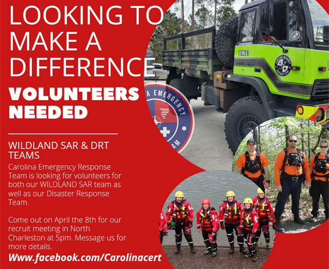 If you've ever wanted to volunteer with a team of individuals that share a passion for helping people during times of need, now is the time. No training or experience? No problem. We make that easy for you here at Carolina Emergency Response Team. From our Disaster Response Team to our Wildland SAR Team. If you enjoy helping people during your free time, we can show you how.